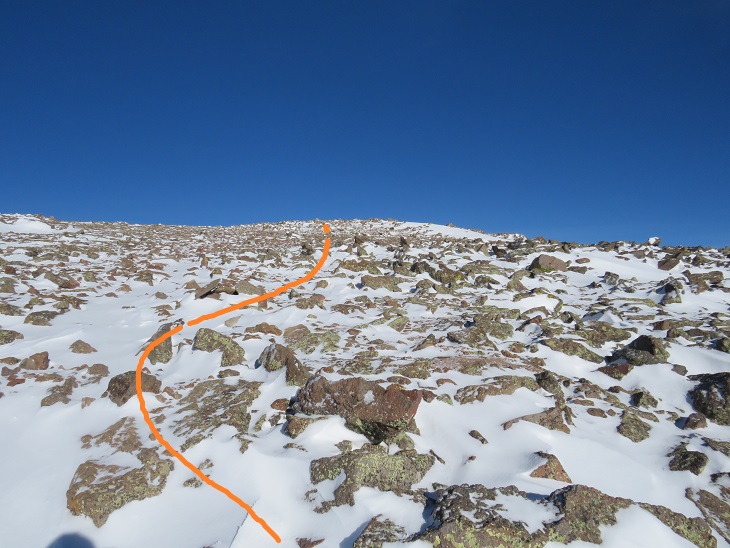 At the top of the gully I found cairns and a trail that wound back to the east side of the mountain to the summit, so I stashed my snowshoes and kept going.