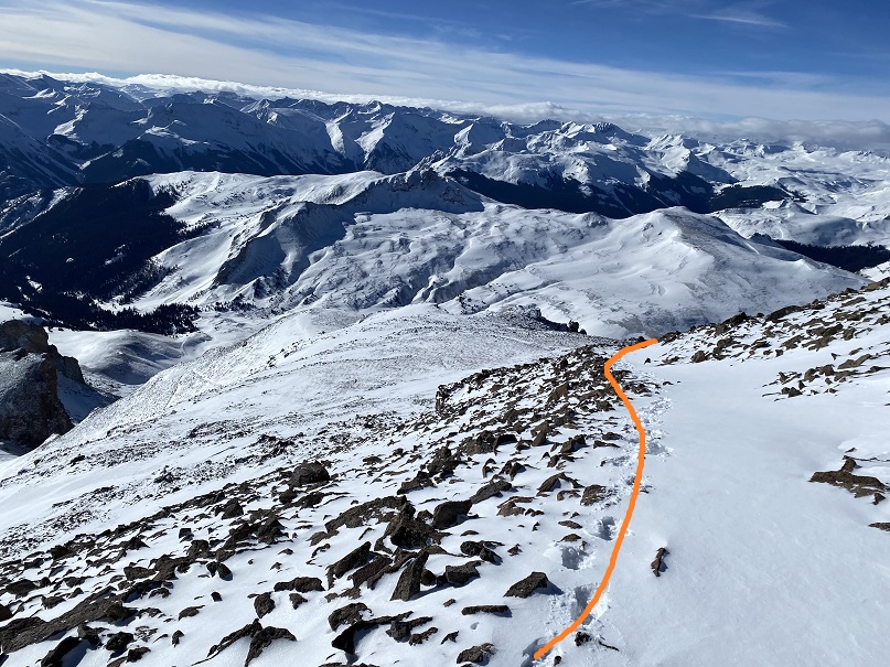 Once on the ridge, I turned right and followed a faint trail northwest. The snow on the switchbacks was a bit sketchy.