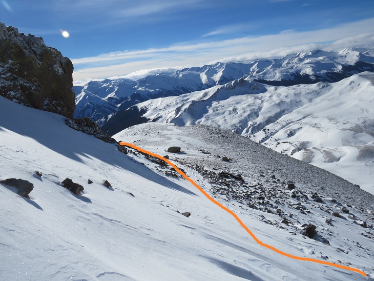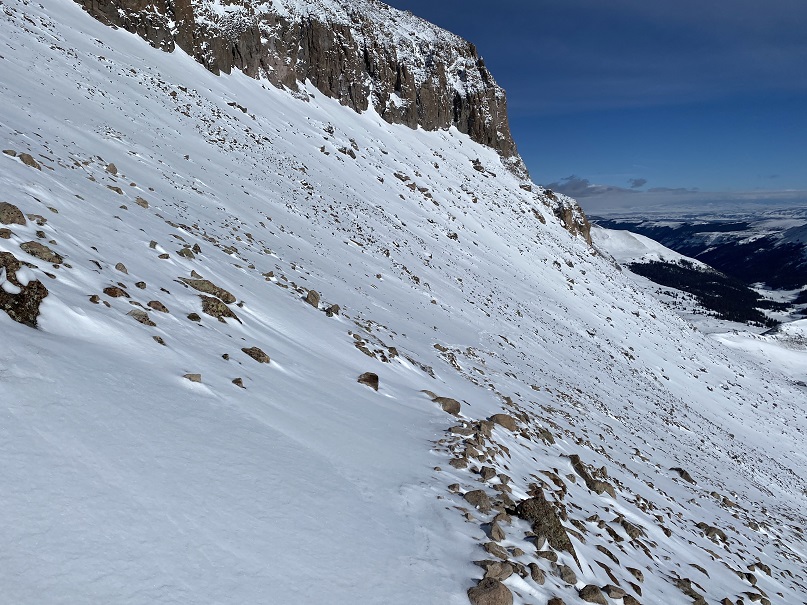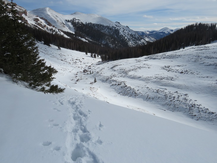 Once down the switchbacks most of my tracks were still there, so I followed them back down the basin. Side note: From here I could see the skiers tracks, and the skier still in the basin below. He’d chosen a different route to gain the ridge, and seemed to be stopping for lunch. Since he was on skis I expected him to pass me on the way down.