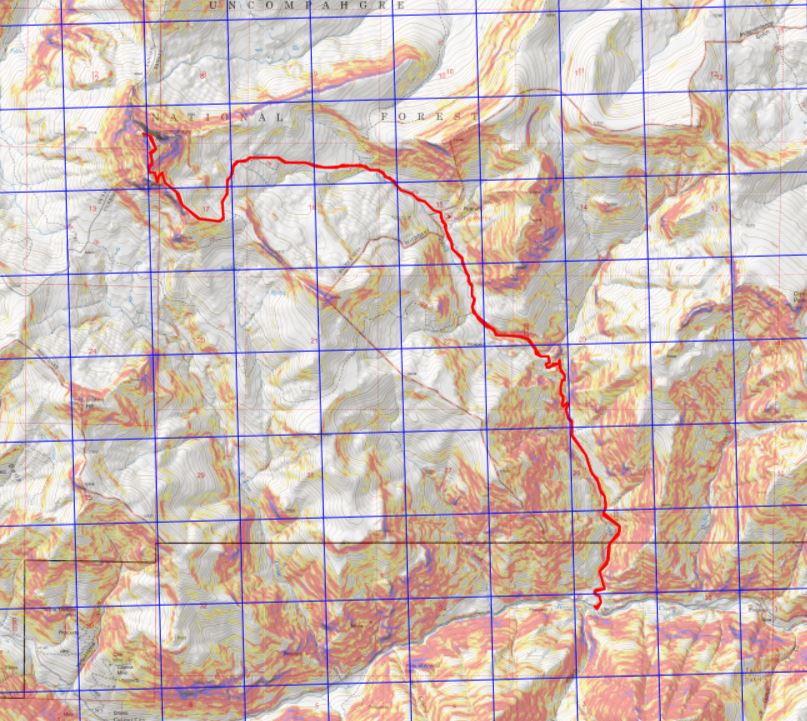 I made it back to my truck at 1:30pm, making this a 16.42 mile hike with 5069’ of elevation gain in 9 hours. I never did see the skier. Here’s a topo map of my route