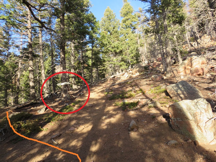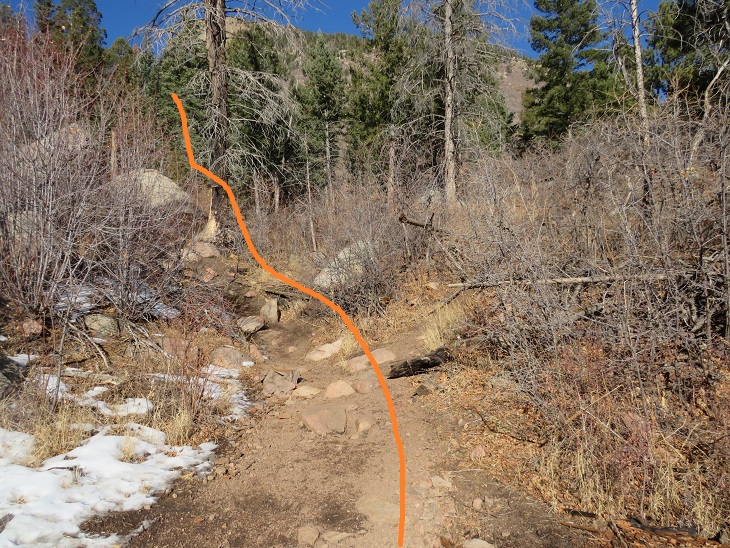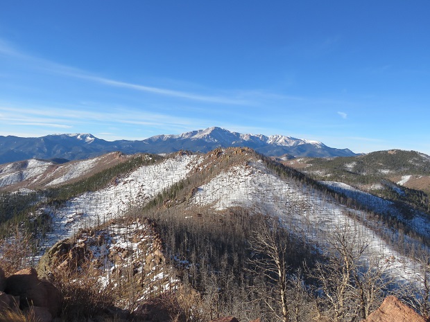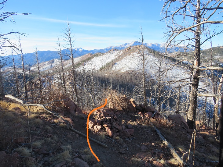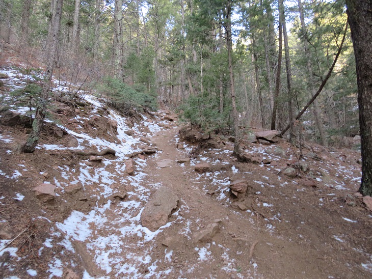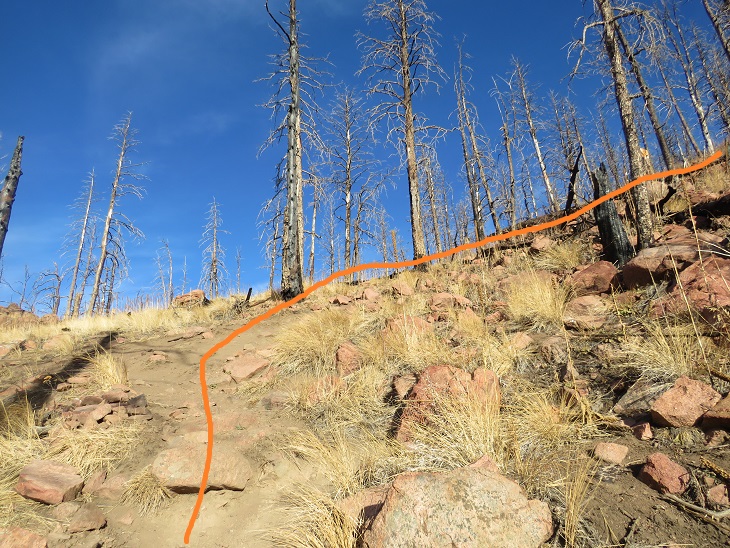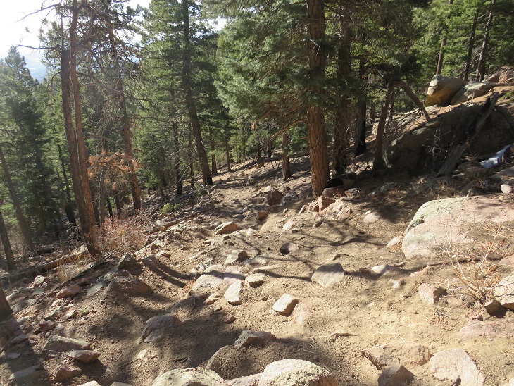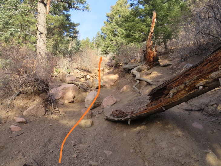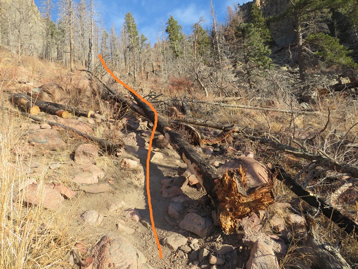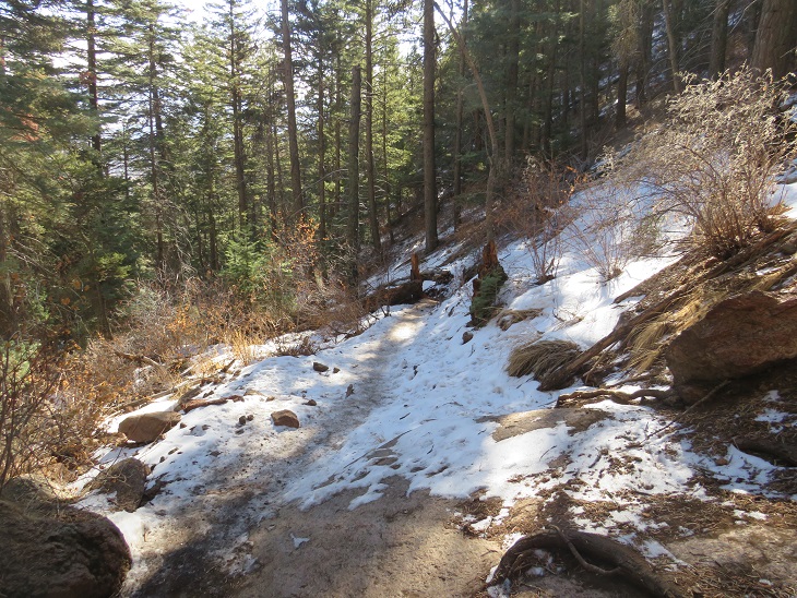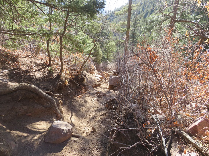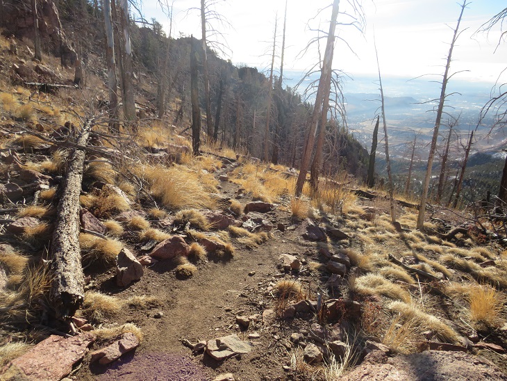 It passes through some of the Waldo Canyon Fire burn scar, and there are downed trees littering the trail here.