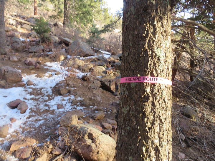 Funny thing: on my way up I saw a pink flag around a tree saying “Escape Route”. These flags were not there on my way back down, and I didn’t see anyone out there all day. I can only assume they were there for Air Force Academy purposes