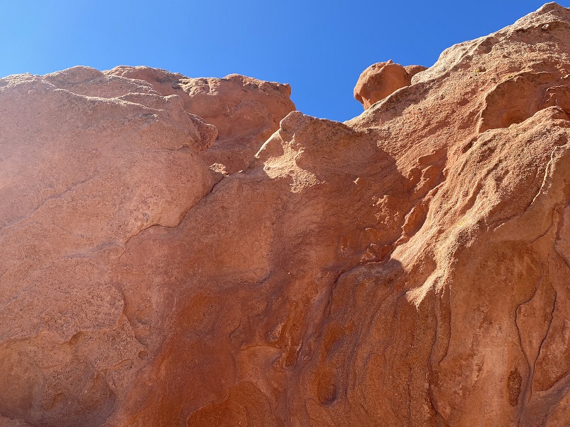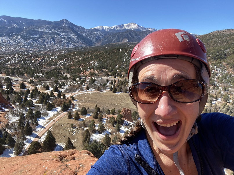 At this point I knew I had to manage my adrenaline, because if I didn’t I was going to fall and die, and I wasn’t going to allow that to be an option:  The rope didn’t go all the way to the ground.  It took me a solid 5 minutes (which felt like an hour), but I was able to get a slight grip on the rock (with my street shoes:  my climbing shoes I’d been assured hadn’t been necessary were in my pack on my back).  I managed to turn myself around and upclimb about 6 feet to the top of the rock and clip myself in.  This rock was the size of a small dining room table. I’m guessing 4 feet across. There was snow where I needed to clip in.