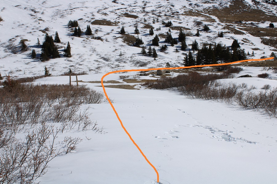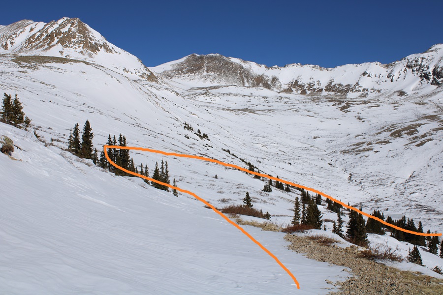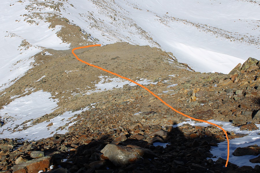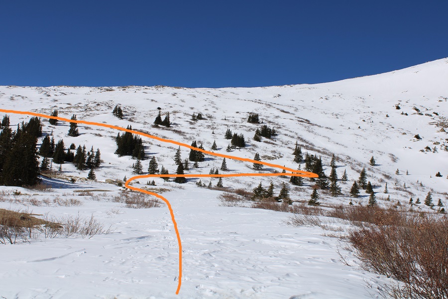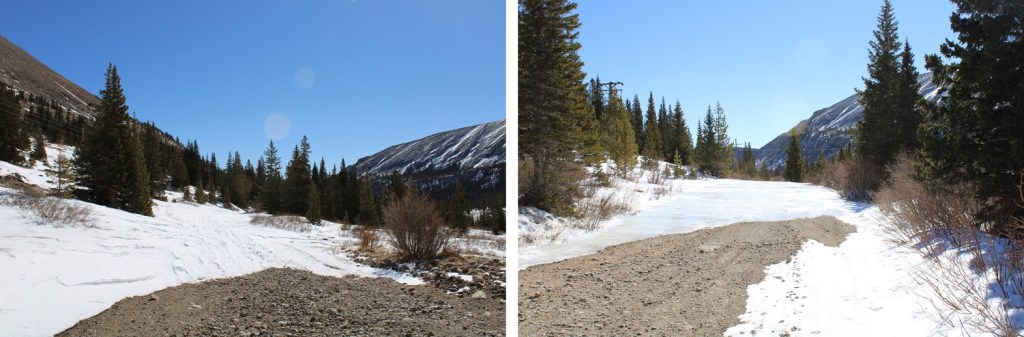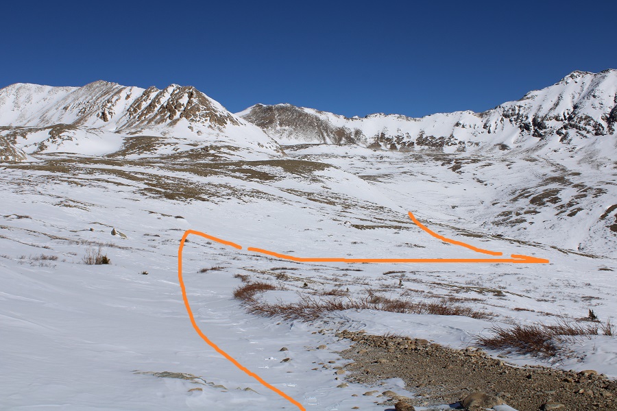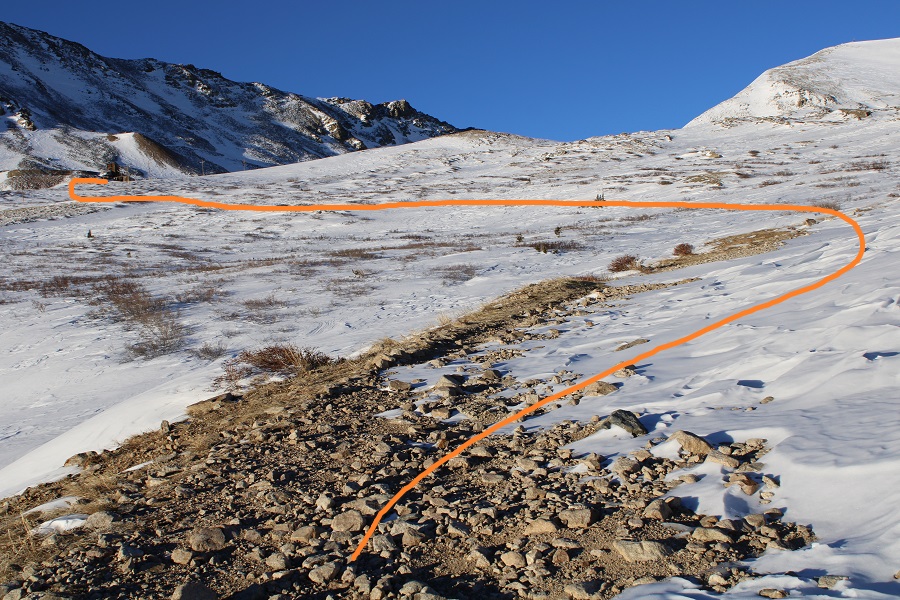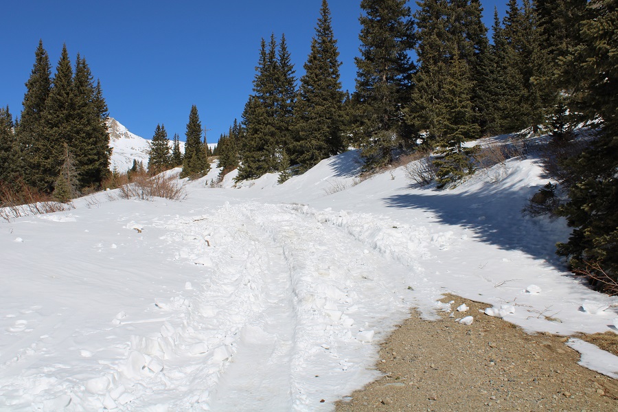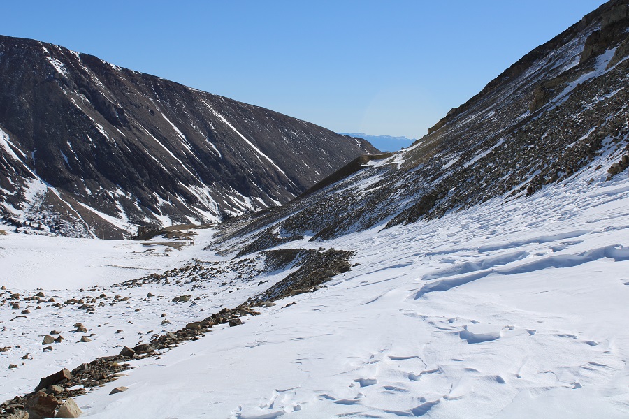 And followed the road to the saddle.  From a distance this road looks mild, but I’ve taken this route in winter before, and the drifts can get pretty steep and go down quite a ways into the drainage (the pictures don’t do the drop offs justice).  It’s a good idea to have traction and an ice axe for this part in winter