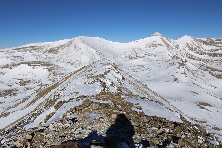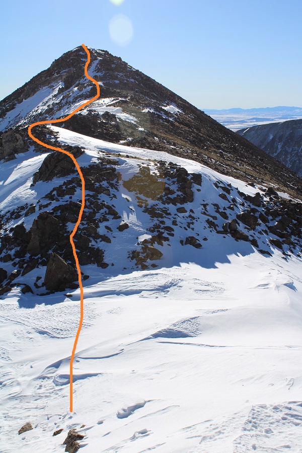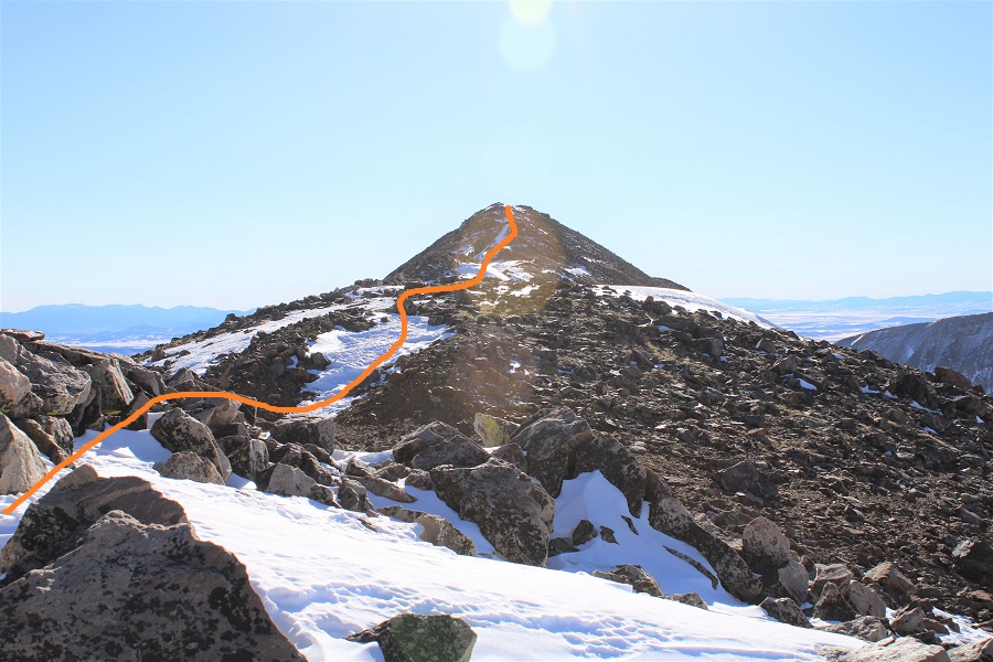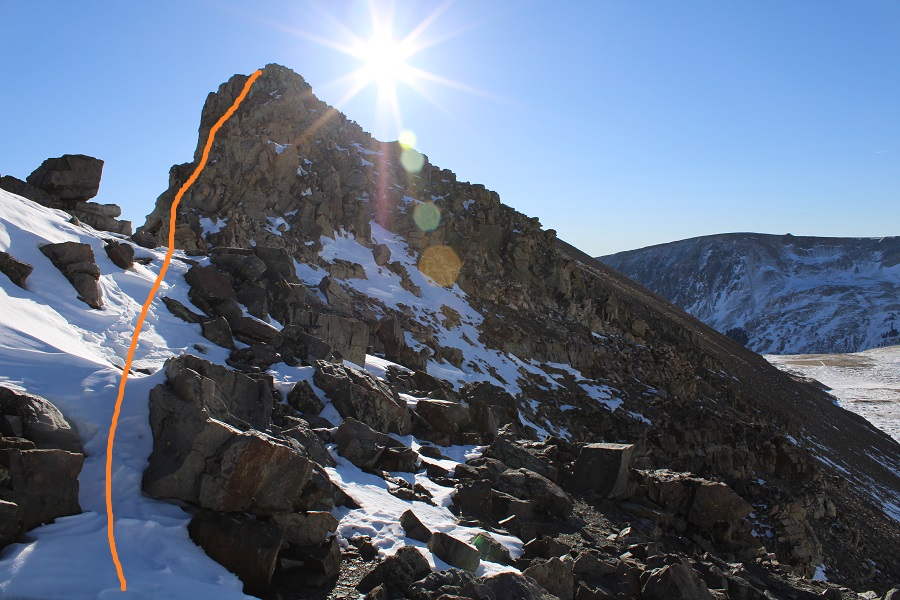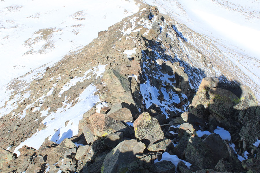 This ridge goes for almost exactly a mile.  After initially skirting to the right, I was able to stick to the ridge proper the entire time, and only postholed a few times in the snow.  This is all class 2, with the snow making it an easy class 3 in just a few areas.  Also, I didn’t remember it until I got back home and looked at my pictures, but the one drawback of this camera are the sun spots when directly facing the sun.  I know what causes them, I just need to be more diligent in the future against preventing them.  Here’s the ridge route, with a bunch of false summits: