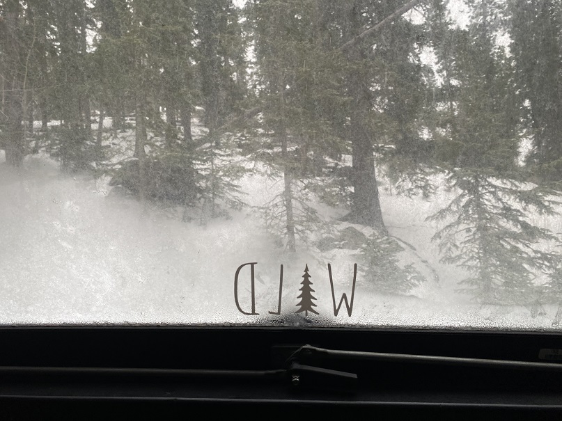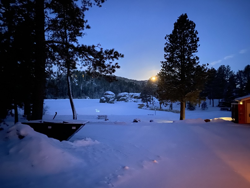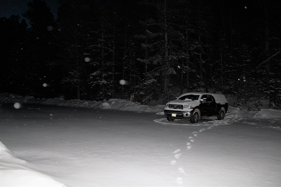 As the sun began to set the snow picked up and the parking lot emptied. I heard a couple of Canada geese fly in, and then honk to each other for a good half hour. I enjoyed some whiskey and thought to myself how cool it was to be inside of this metal box, deep in the Black Hills, as it was snowing. With the heater off I could now see my breath.