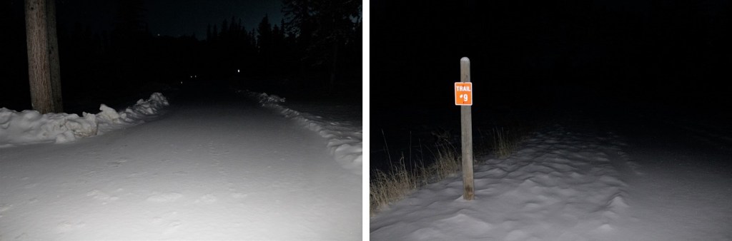 I didn’t wake up until my alarm went off at 5:30am. I peeked outside, and the moon was just setting over the ridge behind Sylvan Lake. Also, there was much more snow than I’d anticipated! I was glad I’d decided to park here overnight, because I’m not sure what the drive in would have been like this morning (but I could guess: not fun). Funny how a 20% chance of snow can turn into 4-6 inches.