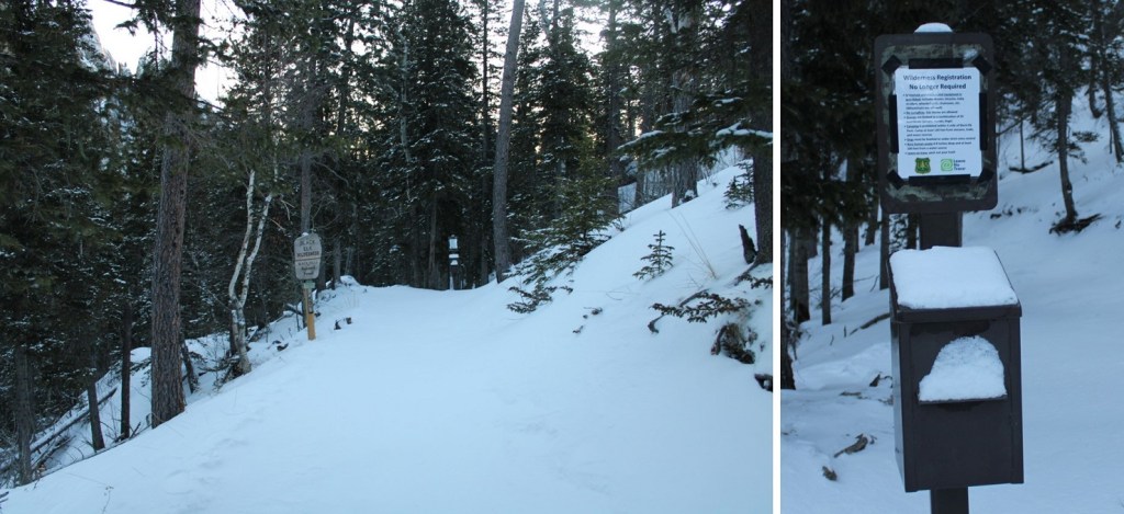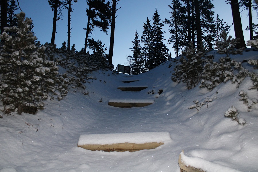 I sat in my truck and ate my sandwich and people watched as I jotted down the day’s notes in my journal. I got out and walked around to find the start of the trailhead, and it started to snow. Here’s a look at the trailhead entrance in the daylight