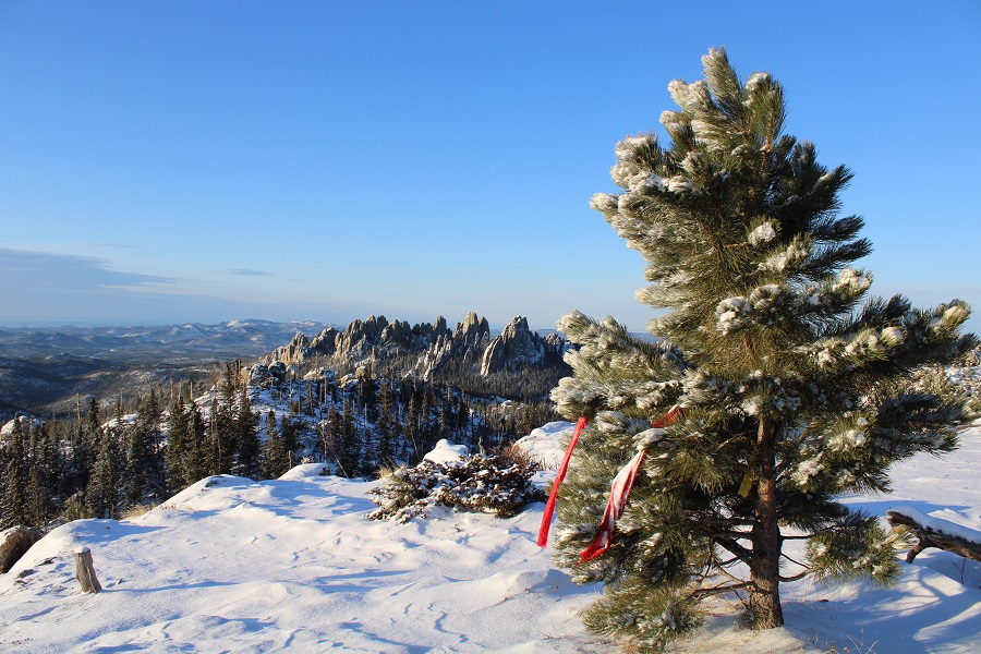 I continued on, and started seeing Lakota tobacco ties/offerings on the trees. Tobacco ties are basically prayer ties. They are to be thought of as a physical manifestation of a prayer. Each color of cloth represents something. Within the Lakota culture, a white cloth is used for a prayer for healing, a red cloth is used for our ancestors and a yellow cloth is used for giving thanks. Blue and green cloth can also be used.