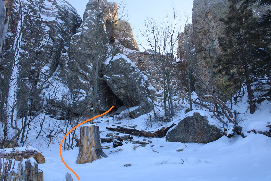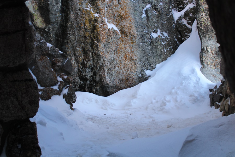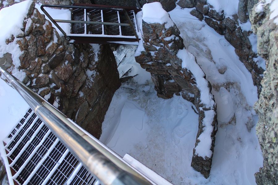 To get to the tower I headed northeast, going through this rock, and up the stairs. This is where it got really icy: the ice was over a foot thick, and slippery, similar to a metal slide covered in ice. Microspikes and good balance are required here