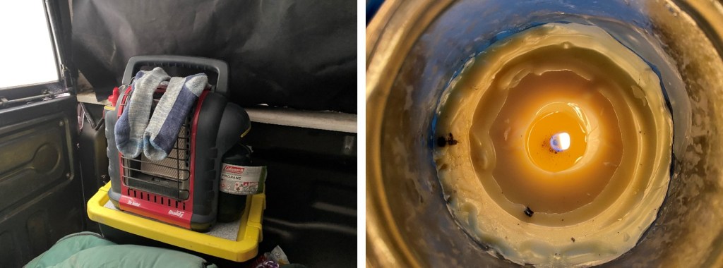 I have a heavy-duty indoor heater, and it usually works so well I only keep it on for a few minutes before turning it off. I also lit a candle because I like candles, and even learned a little something: When the heater burns up all the oxygen the candle will go out. Also, matches won’t light. This reminded me a bit of a canary in a coal mine, and I found it useful information. I turned off the heater and was able to re-light the candle about 5 minutes later, using a flashlight in the meantime. I used the turned off heater to dry my socks (I LOVE this heater!!!)