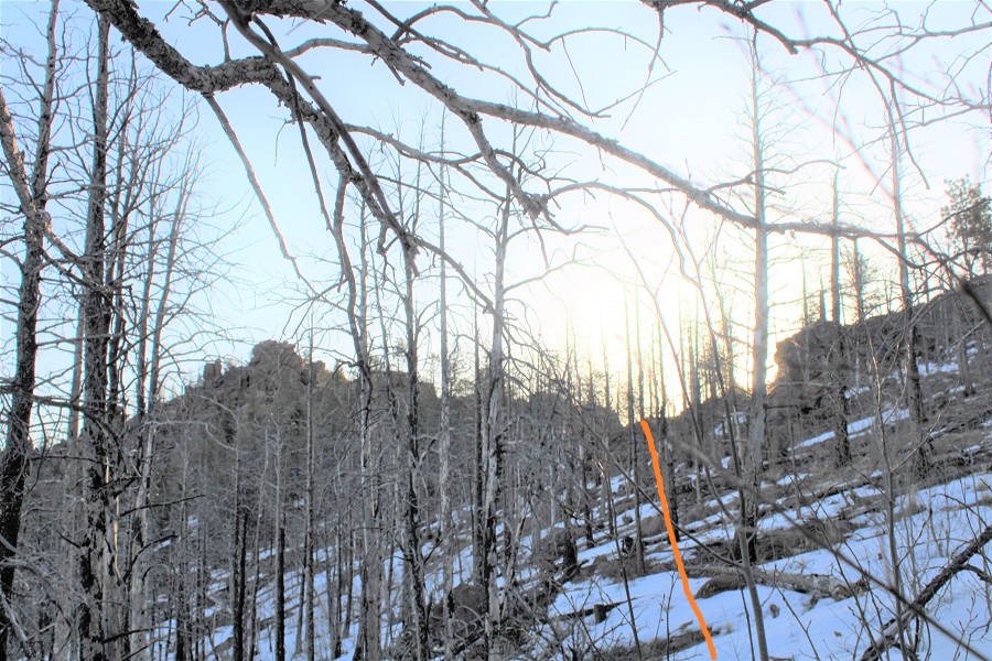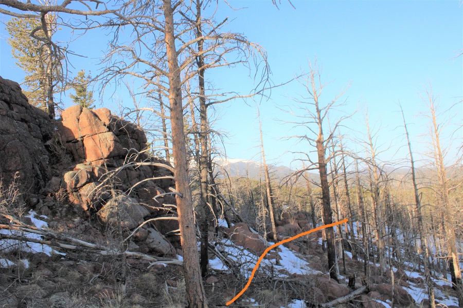Now I stayed to the left (north) side of the ridge. There were a lot of downed trees, but nothing that kept me from making it to the peak. There was snow here, but not enough to need traction. I did posthole a bit. I aimed for the small saddle