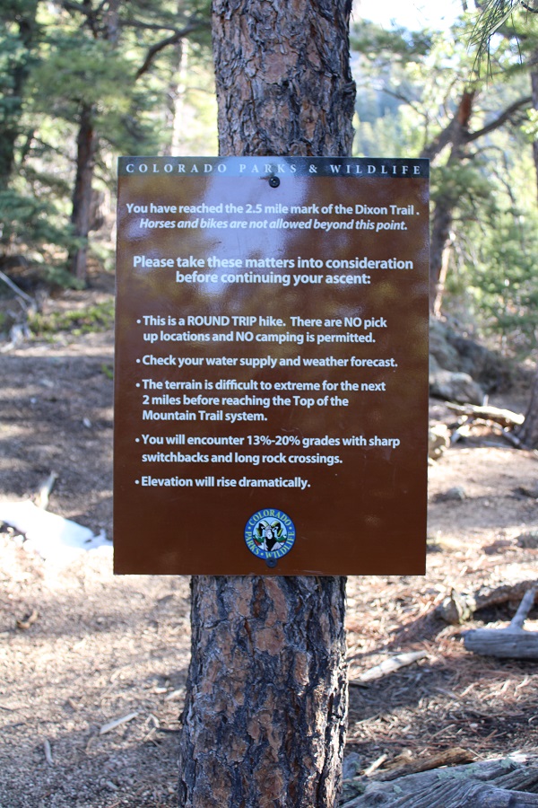 After hiking for 2.5 miles on the Dixon Trail I came to what I initially thought was a camping area. Once I read the sign however, I realized it was a place to park your bikes/horses, as they aren’t allowed any further on the trail.