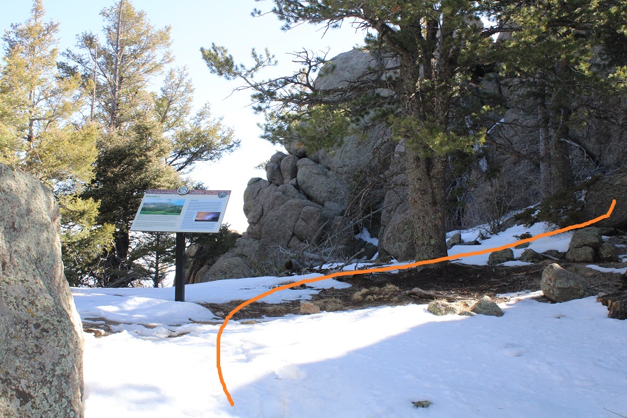 I came upon this sign (which talks about weather, lightening, etc.), turned east (right) and scrambled to the top. I’d consider this a quick but committing class 4 scramble, especially with snow.
