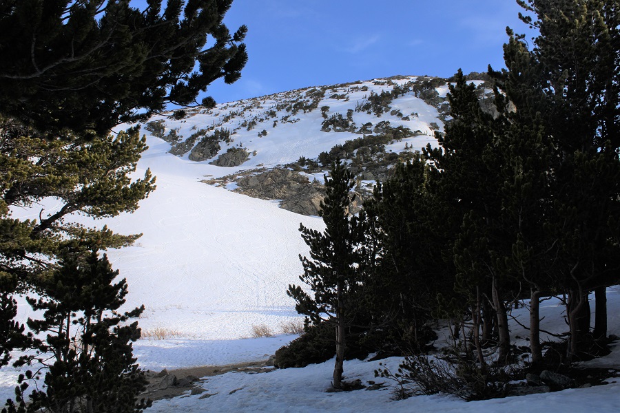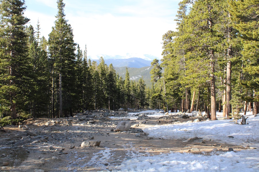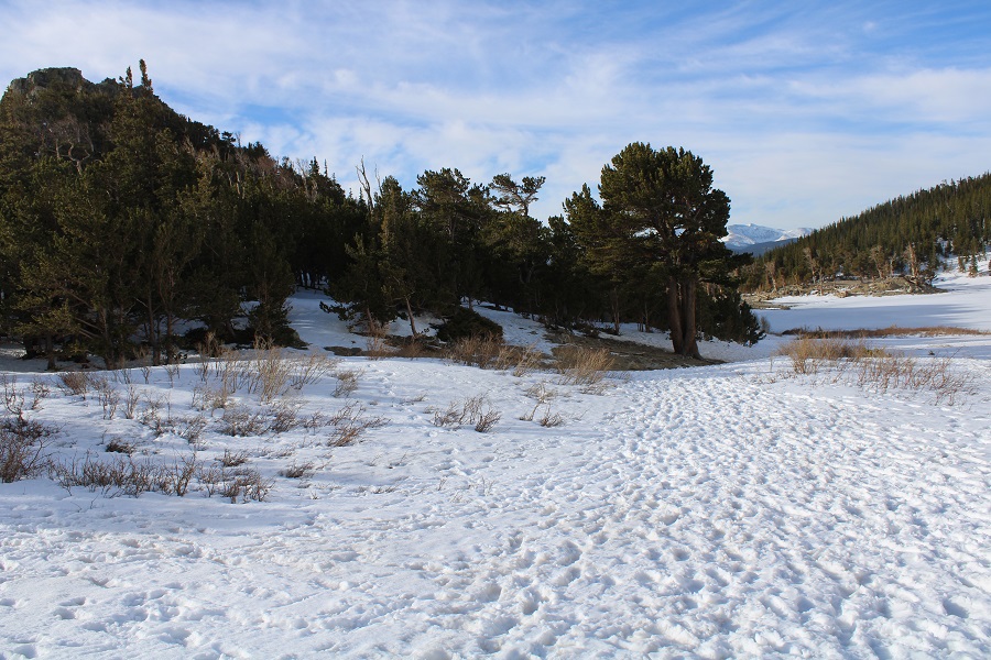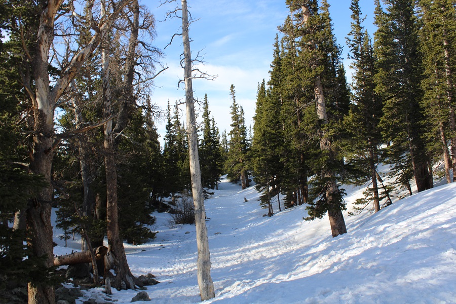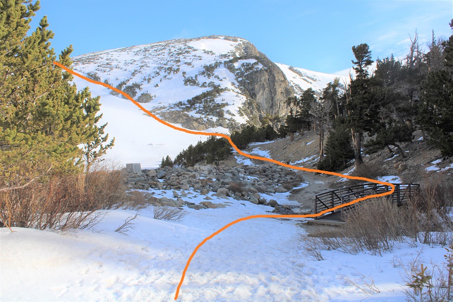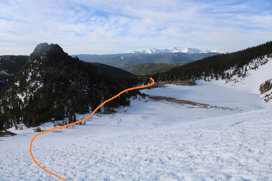 After hiking for .75 miles I came to St Mary’s Lake. It’s covered in snow right now, and to the left of this picture. St Mary’s Glacier is directly in front. Here’s the route I took, crossing the bridge, skirting the lake, and then heading up the slope.