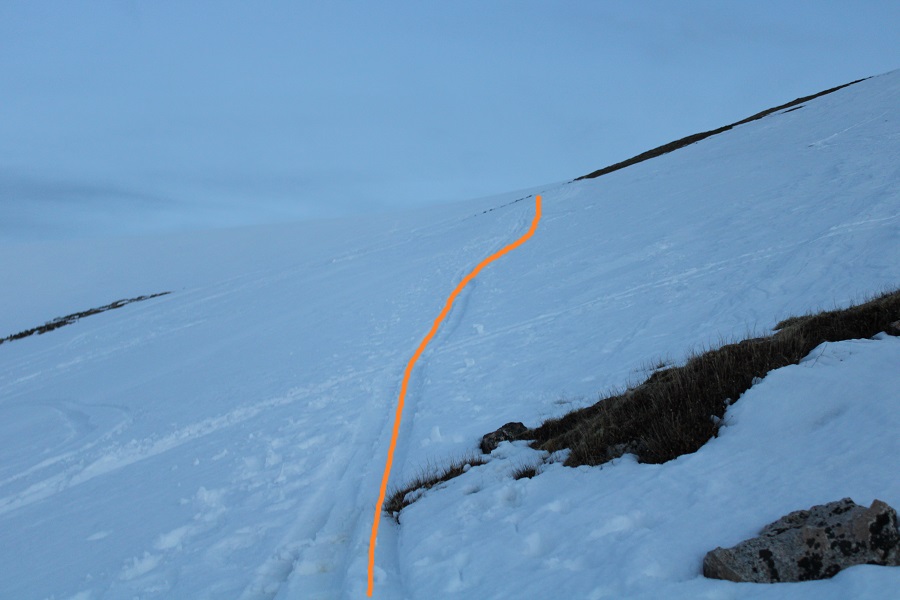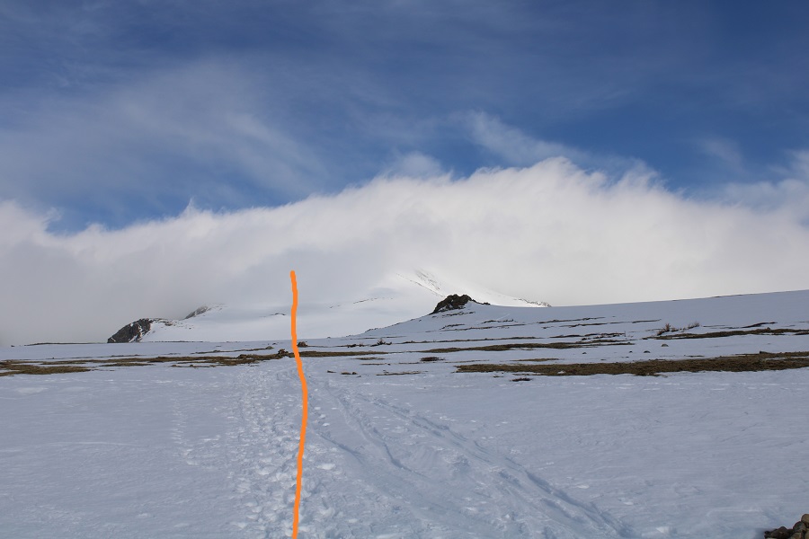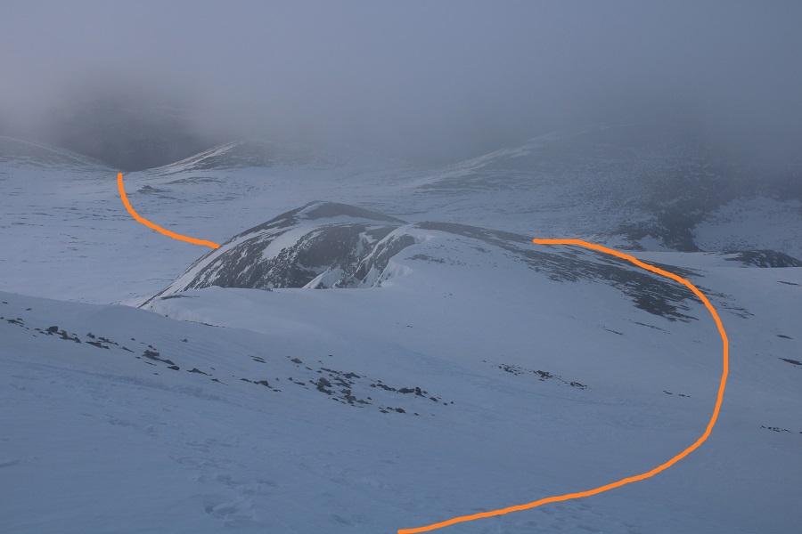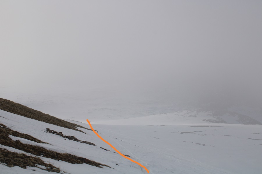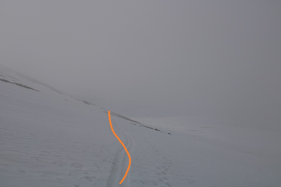 I headed back the way I’d come, careful to follow my footprints as it was getting increasingly difficult to see. I faced the mountain and used my ice axe for the initial descent, then turned and glissaded for a bit. Here’s an overall view of the route back down to the lake