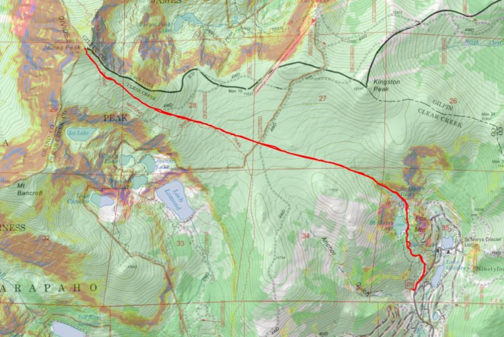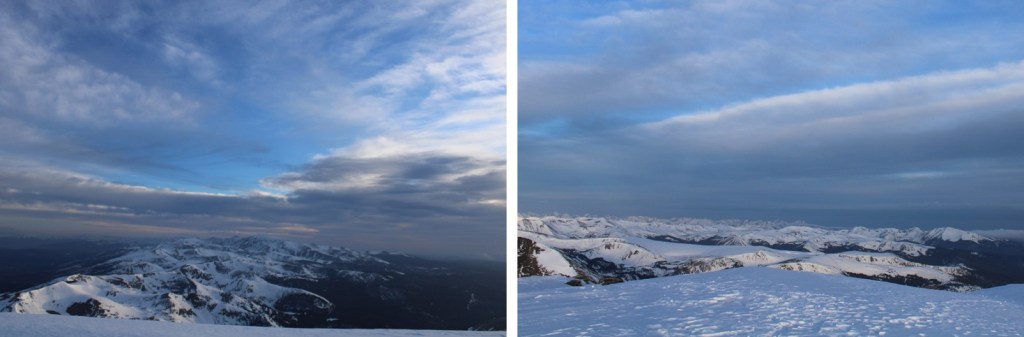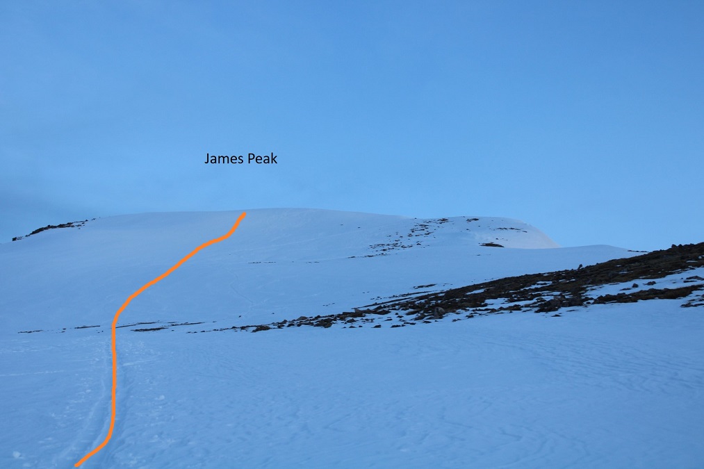 Once at the top I came to a plateau, and could see James Peak in front of me. Well, I couldn’t really in the morning, as it was still dark, but I could tell it was a clear morning by the shooting starts I kept seeing (that was about to change). At the top of the slope, just head northeast.