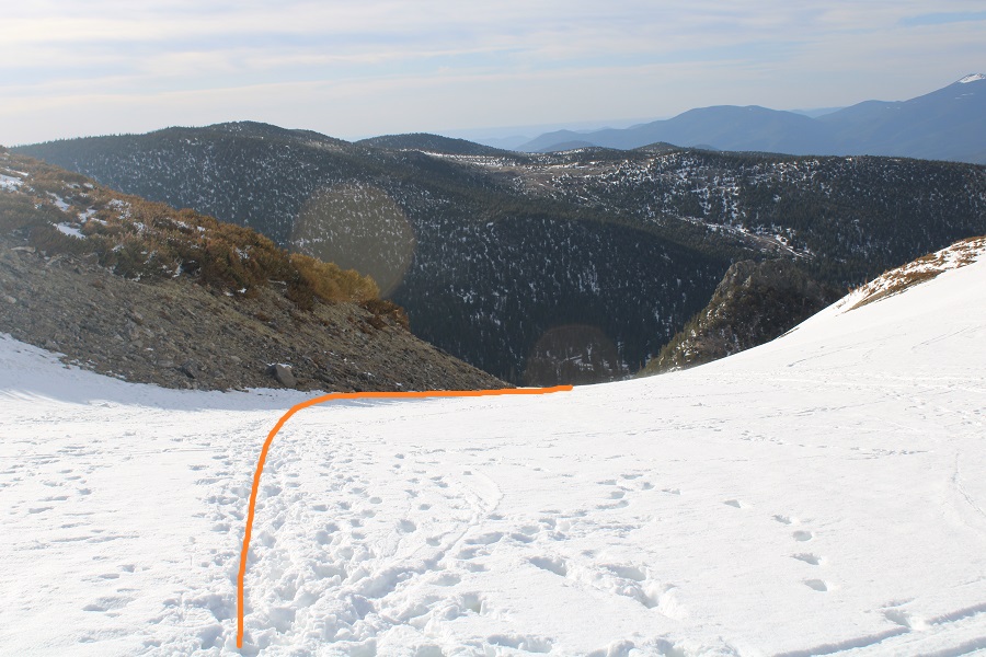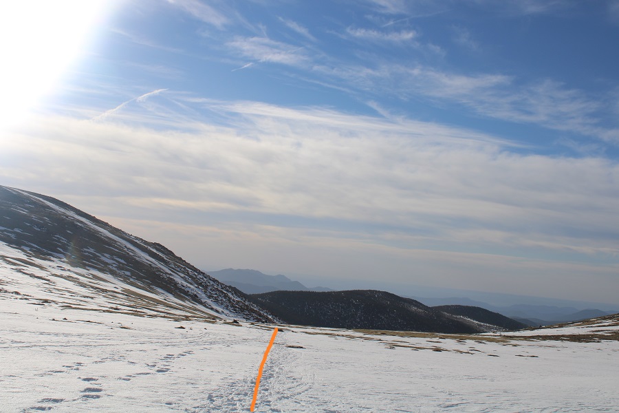 The very last part of this hike included turning north and heading up this slope. I did not need crampons/ice axe on my way up (microspikes were fine) but I did use my ice axe on the way down. This could have been prevented by zig-zagging the slope (dotted line), but I felt it was better to get in some glissading practice.