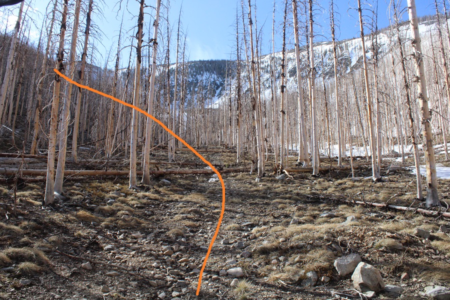 I followed the drainage as far as I could, then headed east to gain the ridge. This was steep, but the bushwhacking was minimal due to the fire
