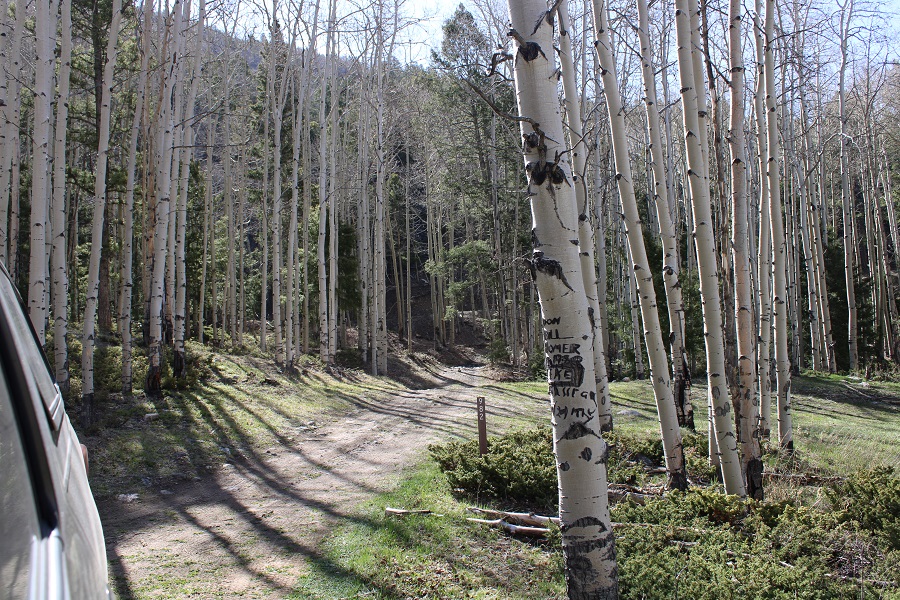 At the junction of 980 and 982 you can either camp, or drive the .6 miles southeast and park just before the trailhead. Here’s the sign where the camping area is, and a view of the camping area (on the right).