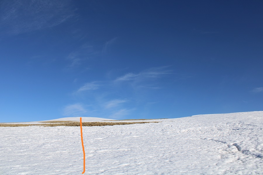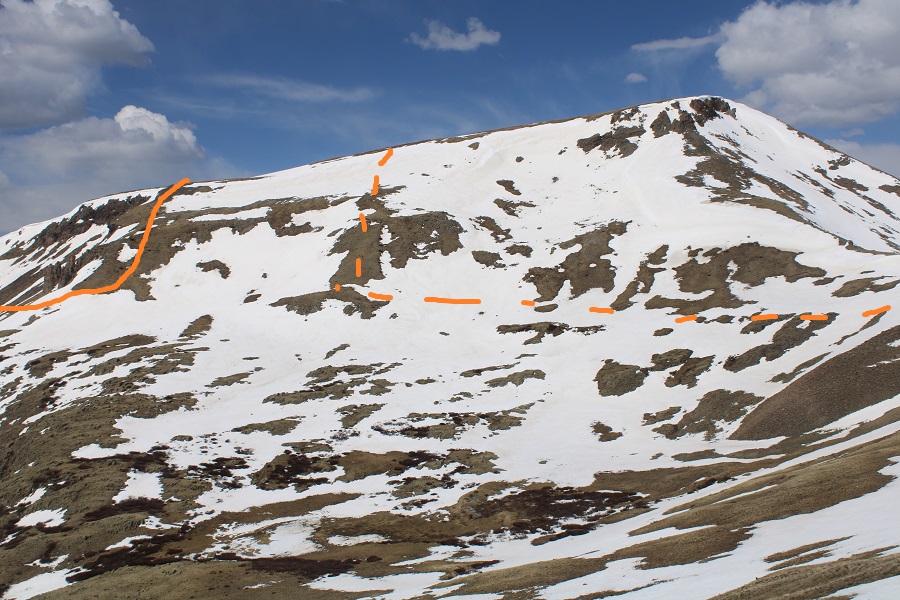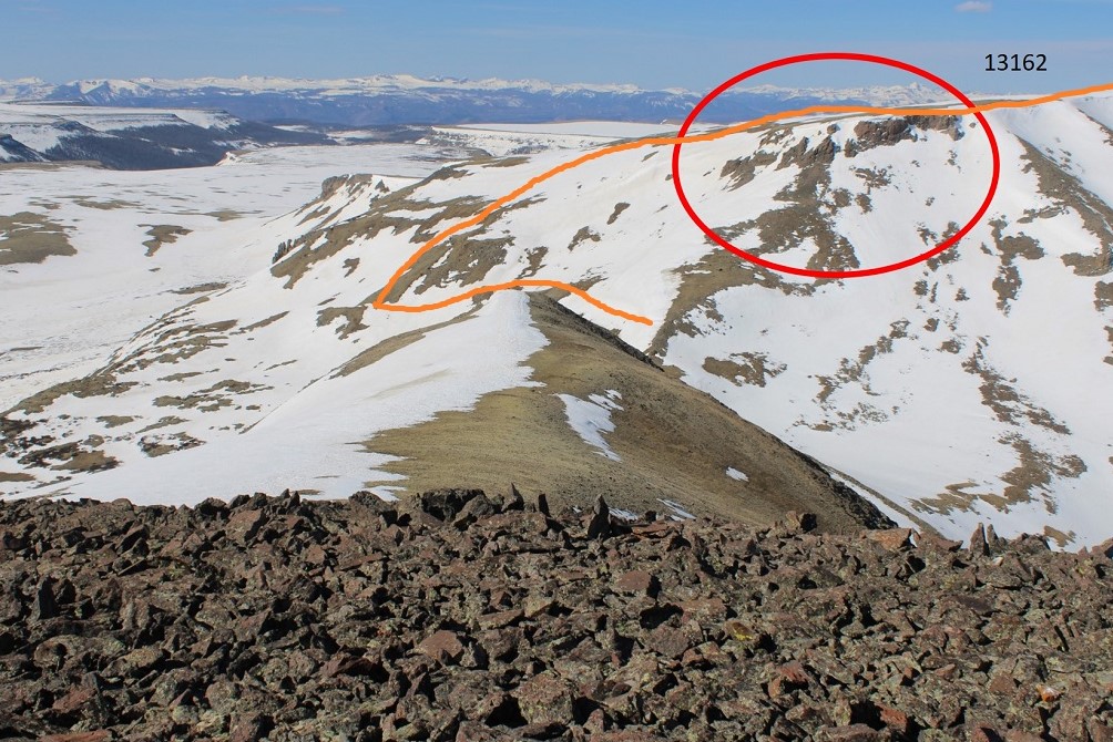 I was still ‘following’ the trail (under snow), and as soon as I started heading north it was time to head up the east side of PT 13162.  Here’s what that looks like (as seen later in the day from point 13020).  Solid line is path up, dotted line is the route I took down and across to the 13162/13510 saddle.  I was just doing my best to avoid the snow.