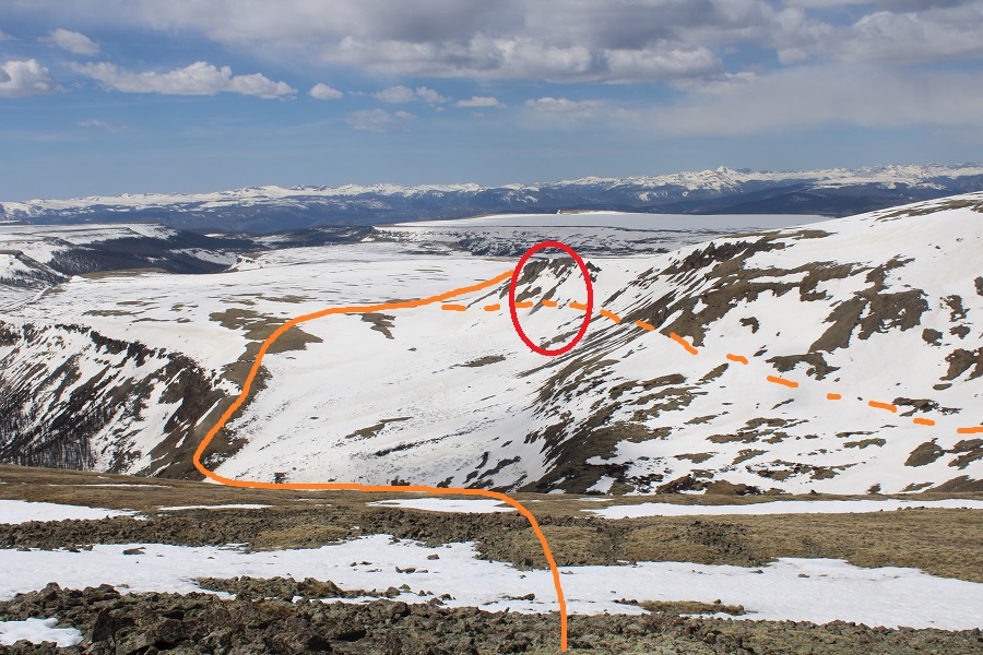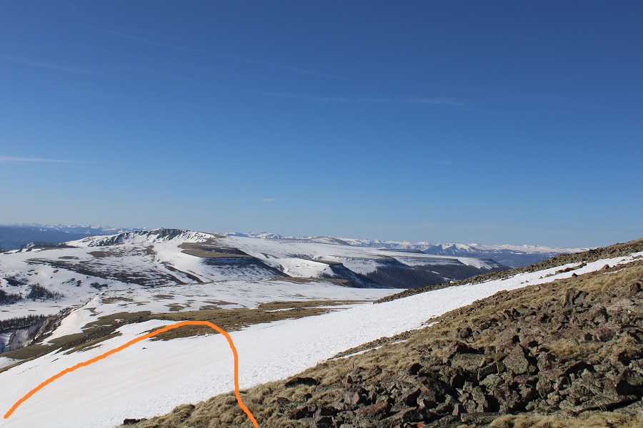 The snow wasn’t totally avoidable however, and I did posthole through the section of willows.  From down in the basin, here’s a look back at my route down.