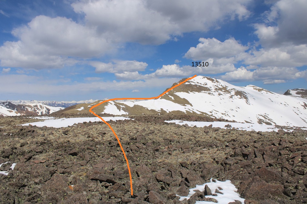 From here I could see the summit of 13,510 to the northeast.  It looks like it should be a simple ridge hike to get there, but unfortunately, there’s a steep section in the way, so I re-traced my steps back to scenic trail 813.