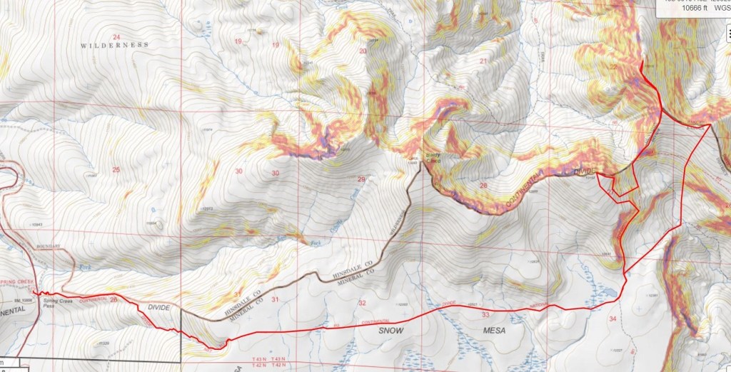 Once on the mesa I followed the Colorado Trail / Continental Divide Trail markers for 3.3 miles.  These markers are great most of the time. In the summer the trail is well defined and not needed.  When I was here last they were covered in snow and useless.  Today they were nice benchmarks, keeping me on track since there were no tracks.  In the morning, the snow was firm (not so by noon).  The trail initially  looks flat, but you’re really losing and gaining elevation all the time.  This was especially frustrating on the way back.
