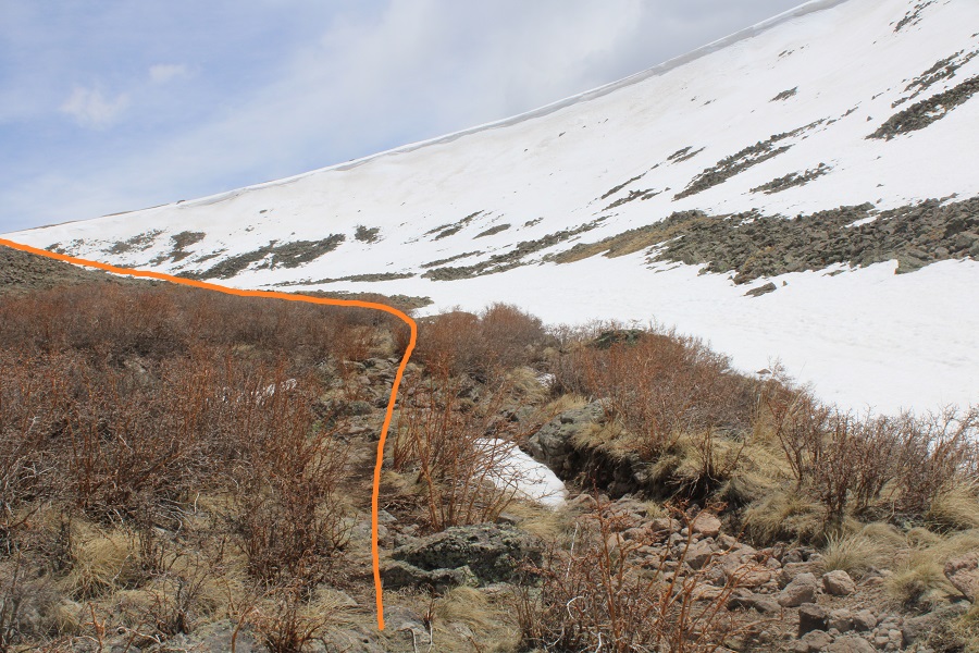 Time to head back.  I didn’t want to take the way I’d hiked in back out because of deteriorating snow conditions and possible slide activity. Instead, I hiked directly down into the basin, heading southwest.  Here’s a view of the route I took down from 13020, as seen from my way to 13162.  I just did my best to avoid the areas of snow when possible (and the willows at the bottom).