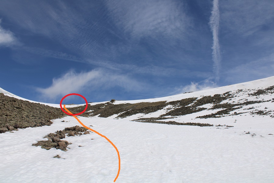 Here I’ve outlined the route I took in (dotted line) and the route I took out (solid line).  Trail 787 was dry on the ridge/elevation gain back to the snow mesa.  I could see it from the summit, and aimed there, doing my best to avoid snow on the way down. I’ve circled the small slide area.