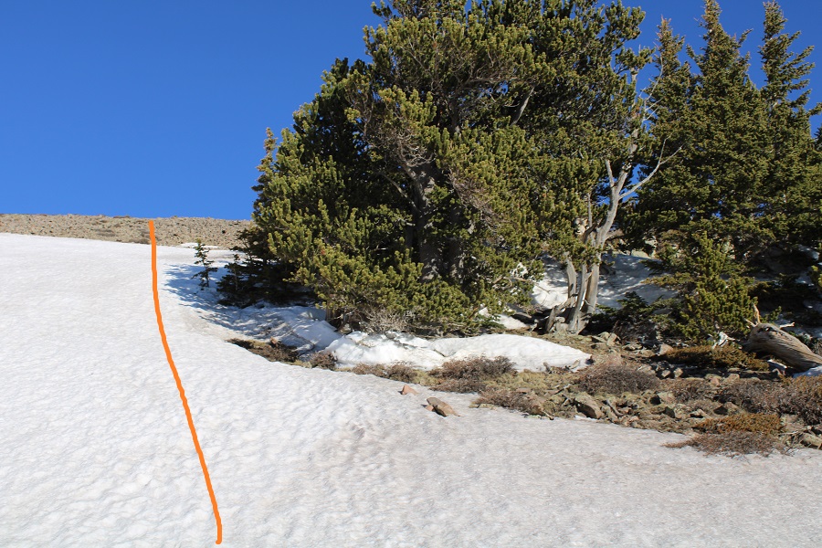 This time, when I entered the trees, I stayed right.  It was my intention to avoid all the bushwhacking I’d one on the way in by taking trail 1350 out.  I once again encountered the mashed potato snow at treeline