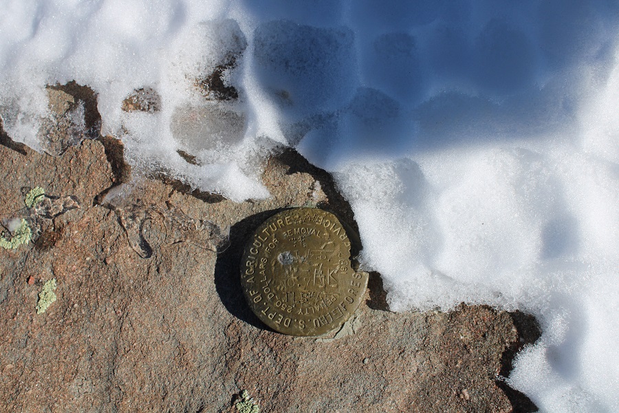 There was a benchmark on the summit.  I took off my pack and realized I’d lost my water bottle somewhere.  That’s what I get for not strapping it in.  No matter, there was plenty of snow if needed.  I’d have to look for my water bottle on my way back down.