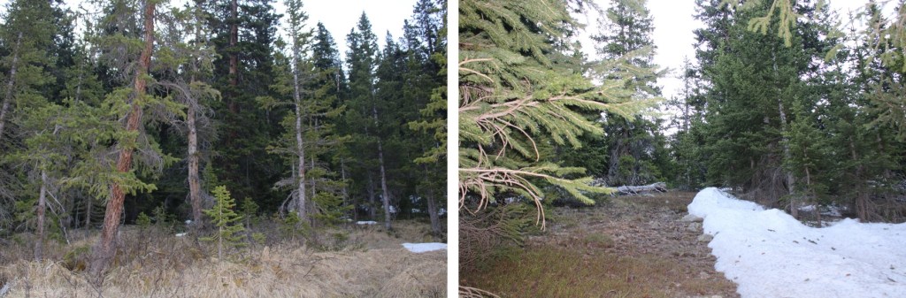 Then, at 11180’ I followed a small drainage into the trees, and headed east to treeline.