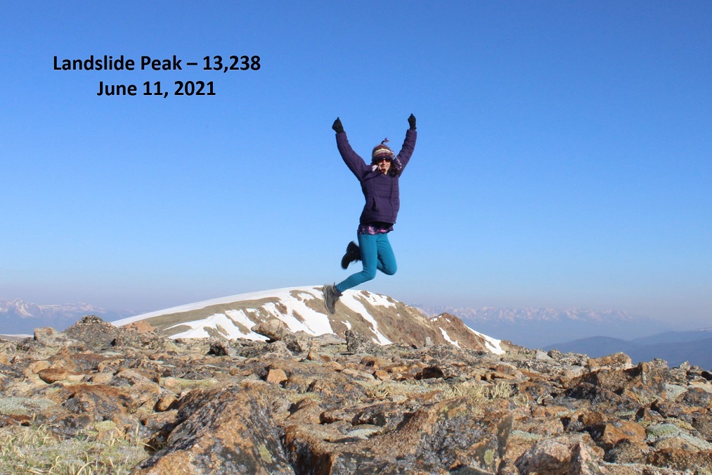 I summited Landslide Peak at 7:15am.  I’m jumping for joy because this is the 250th unique 13er in Colorado I’ve summited solo.  Woot!