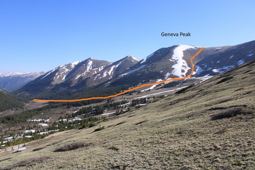 Once at treeline my route was obvious.  I just aimed for the drainage and followed it up.  Note:  This is the southeast face of Geneva Peak, and it’s pretty much all tundra.  I could have just gone up the ridge and ended up in the same spot, or followed the curve of the drainage all of the way right and done Landslide first.  Lots of choices here.