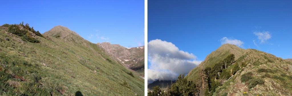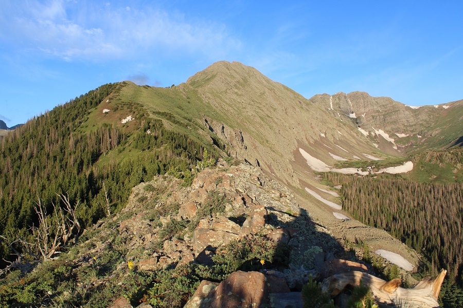 Once I was on the ridge, I followed it southwest to treeline. This is a long ridge, and it seemed to take forever to make it to treeline. Here’s my first glimpse of Little Horn Peak
