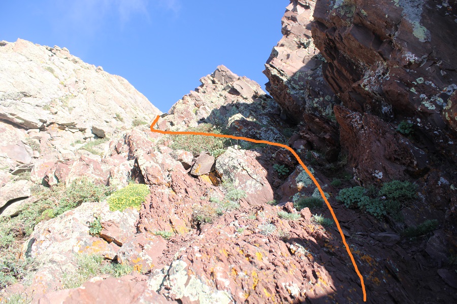 Go up the gully and cross back over to the right side of the ridge