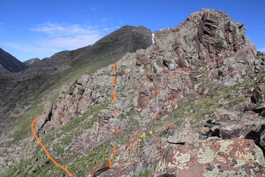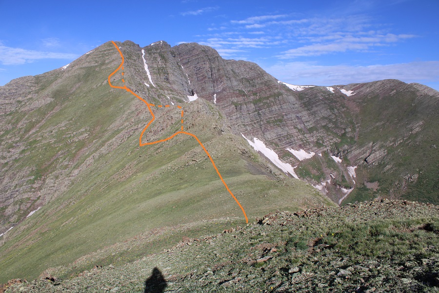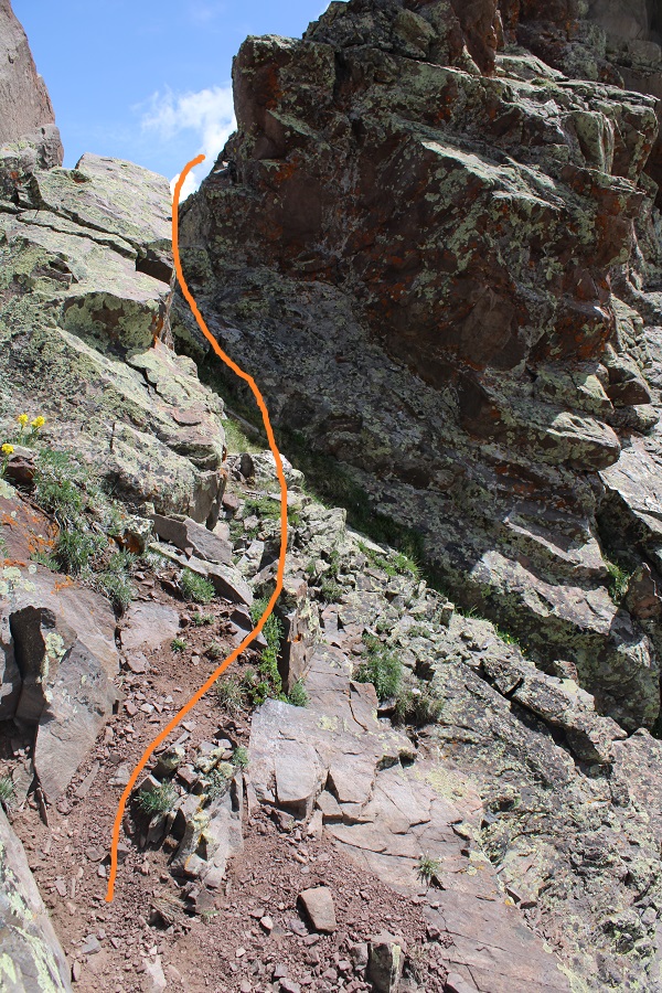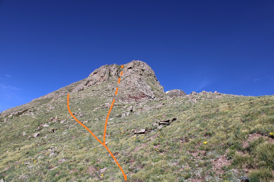 From the saddle, here’s how you keep this a class 2 hike (dotted lines show the class 3 route)