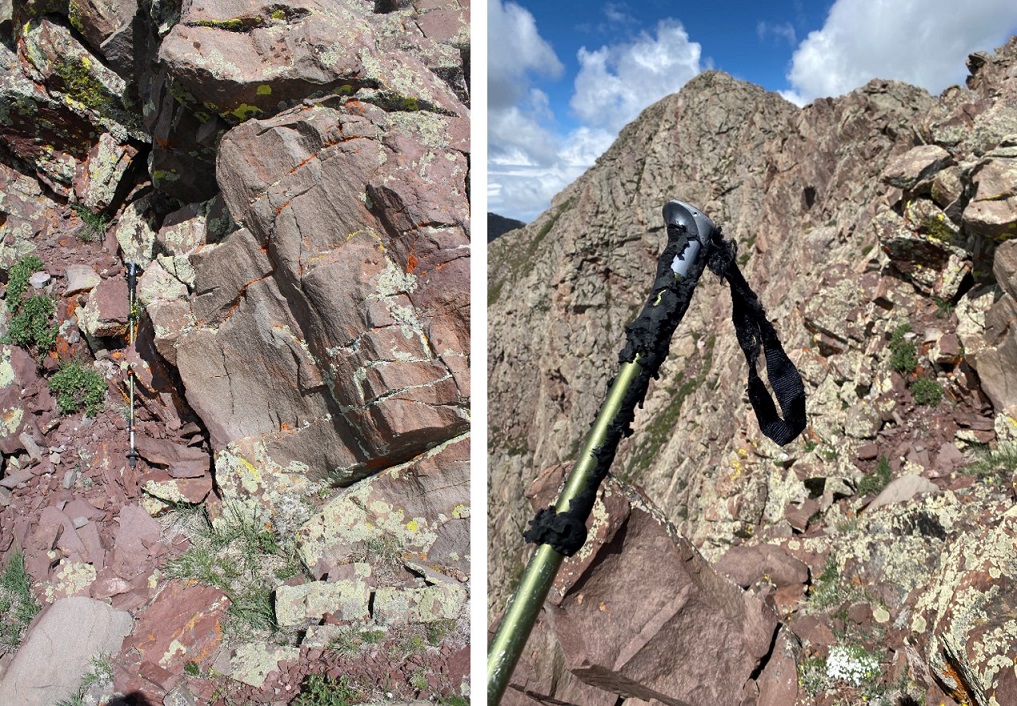 I made it to the ridge and looked around for my trekking pole. It wasn’t where I’d left it. Instead, it was about 15 feet away, at the entrance to a marmot burrow. I picked it up and found some marmot had turned it into a snack. Just adding more photographic evidence to prove the case “Marmots can’t be trusted with trekking poles”.