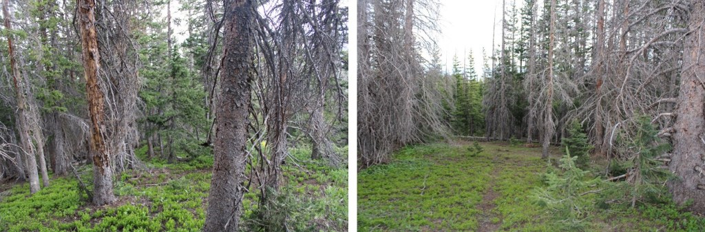 The rain quickly turned to hail and I had to put my camera away. Here are some pictures of below treeline, in-between bouts of rain/hail. I just kept descending northeast, and when the ridge ended I continued east towards Horn Creek Trail. Once again, I’d pick up game trails and then lose them. A little advice: you should be able to hear Horn Creek flowing below you to your right if you’re going in the correct direction.