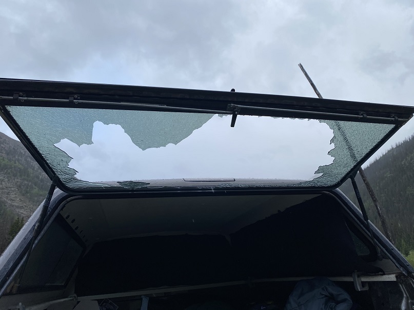 I looked up, and the back window to my topper crumpled and broke into thousands of pieces. I honestly thought I’d been shot at, and turned around but didn’t see a bullet hole anywhere. Next, I gingerly opened the window, crawled out of the truck and took a look around: no one in sight (but it was still raining).