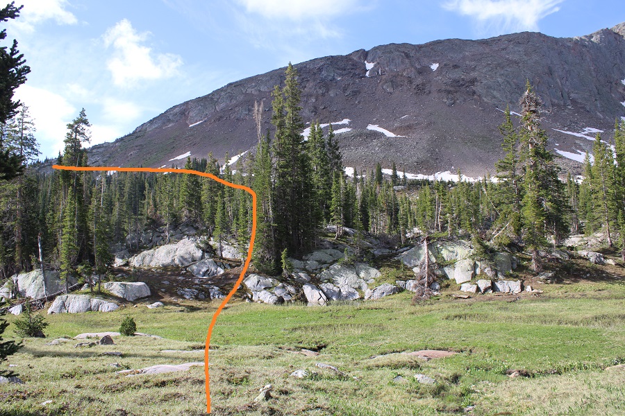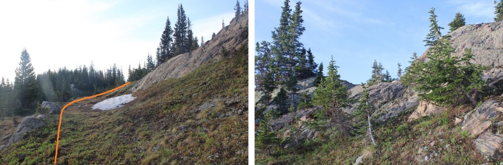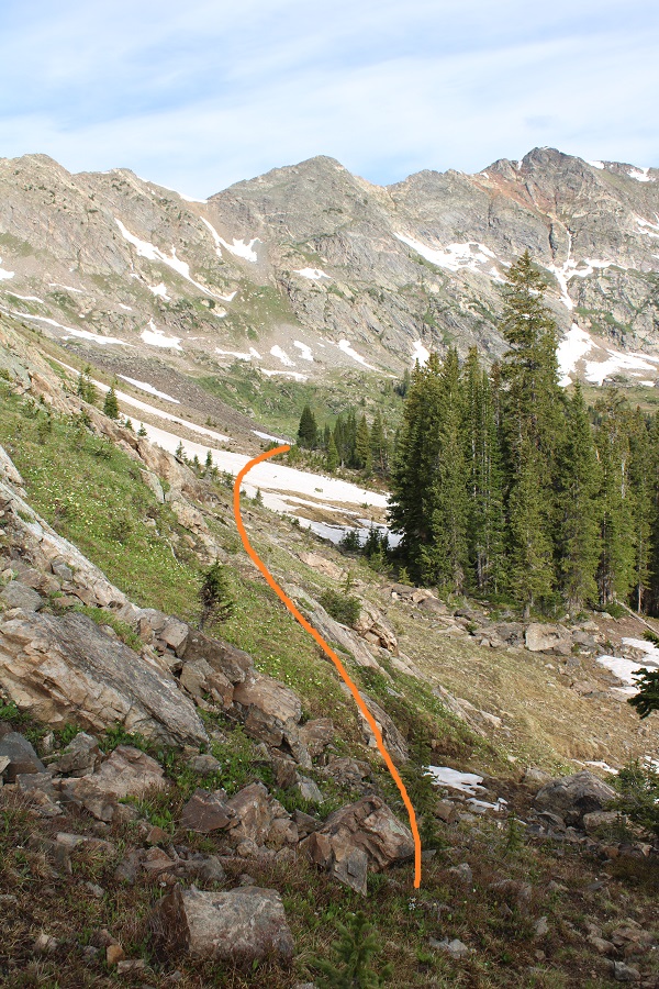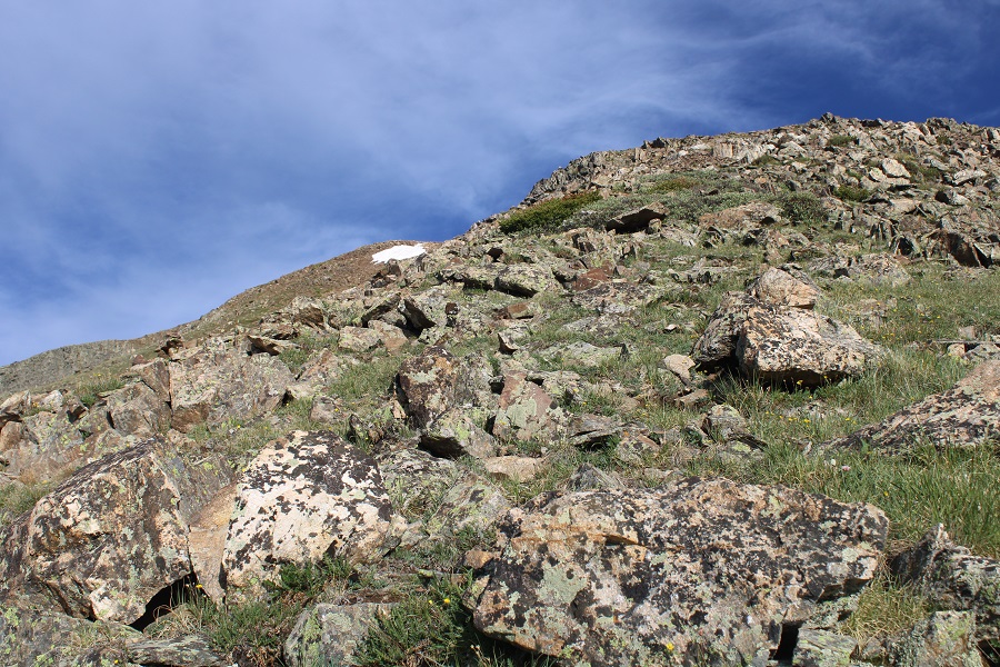 I continued following the well defined trail to 11330’, then left the trail to head south towards the ridge, aiming for a rocky ramp that hugged the side of the mountain.