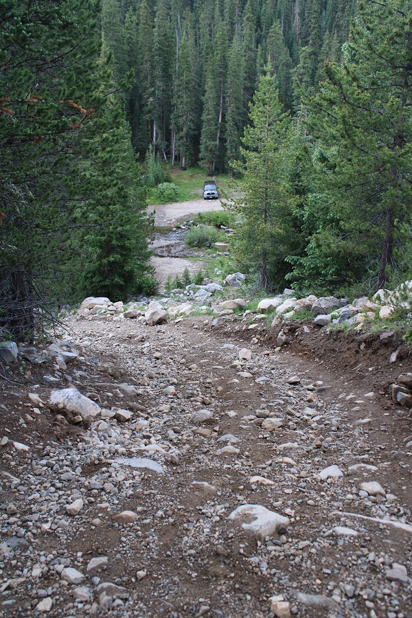 The road curves around a bit, but you can just go straight up the hillside and pick up the road from there.  The stream was only a couple of inches deep.  You could drive across it, but it only saves you about 100 feet of hiking, so it’s not really worth it.