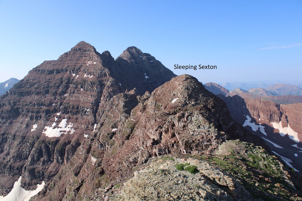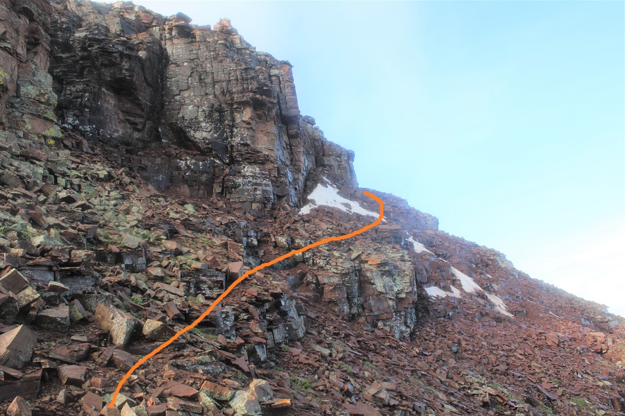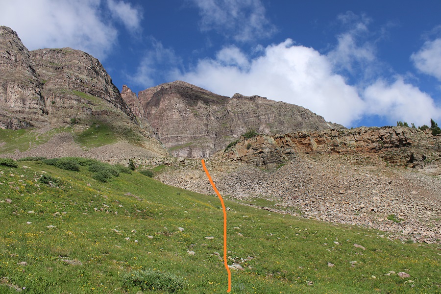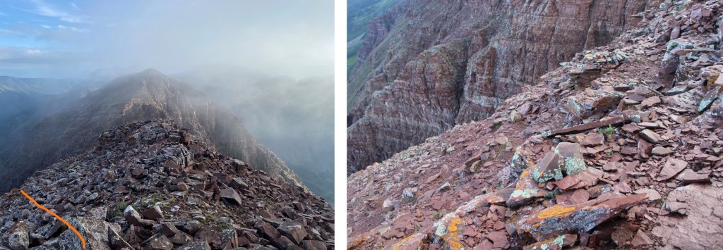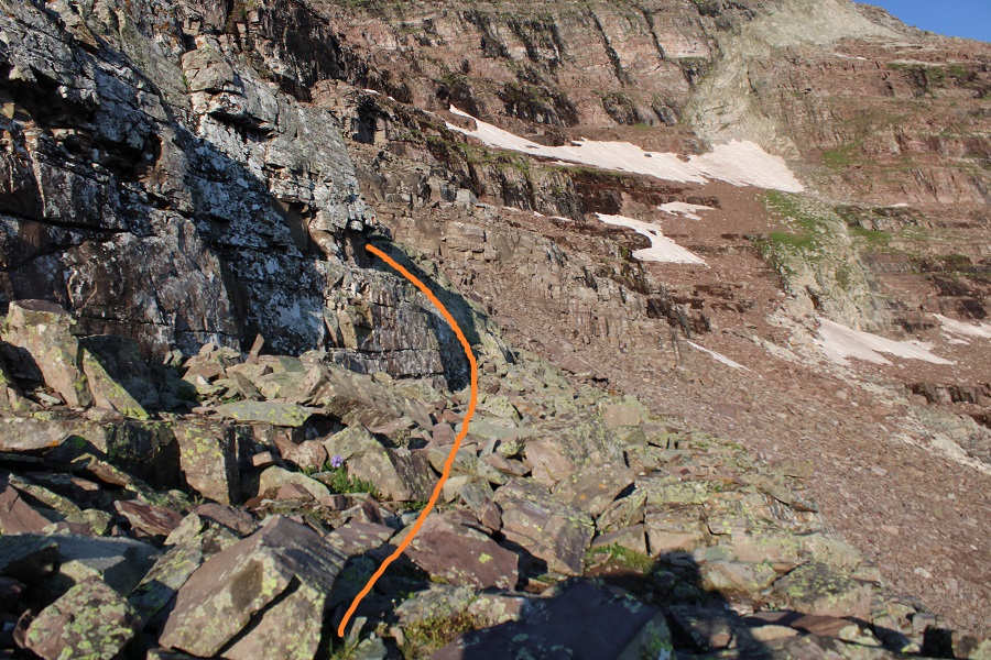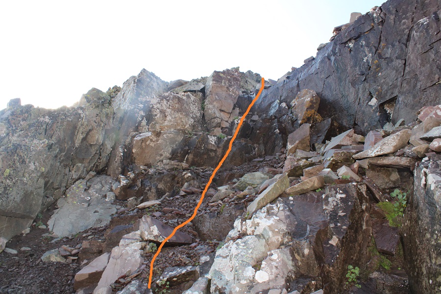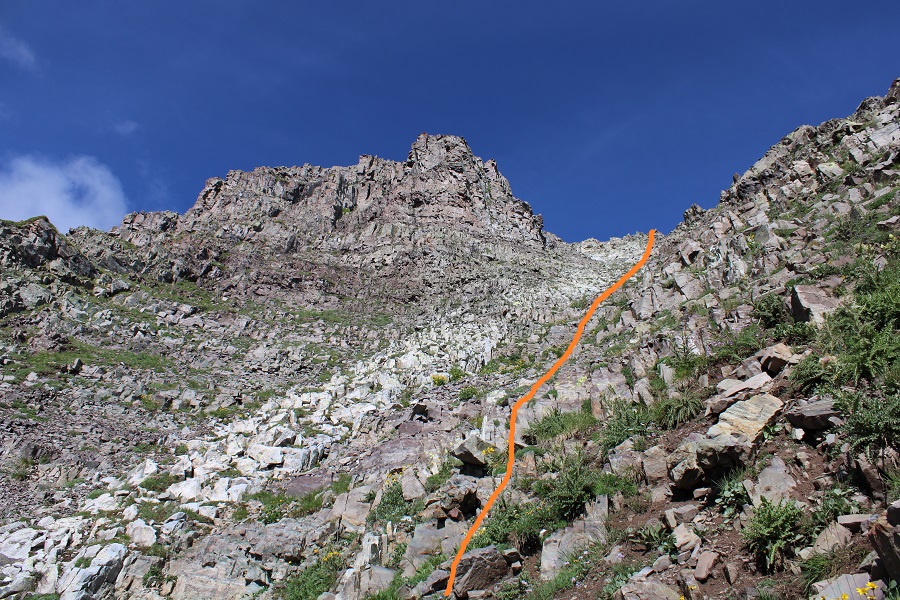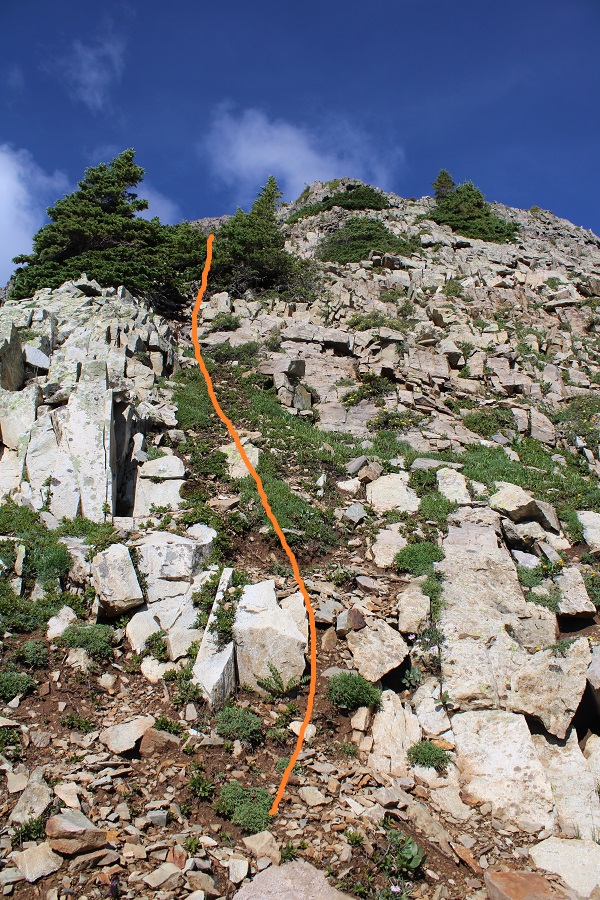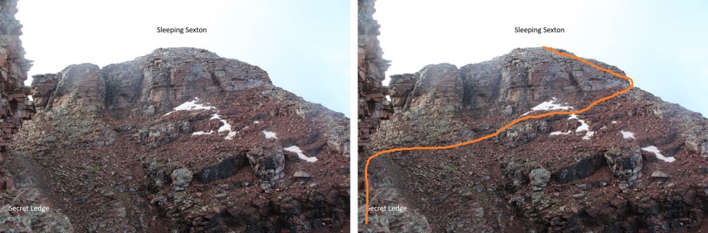 I was now at 13,130’, and parallel with the saddle between Sleeping Sexton and the false summit. I followed the contour of the mountain to the ‘secret ledge’. Here’s what that looks like heading in