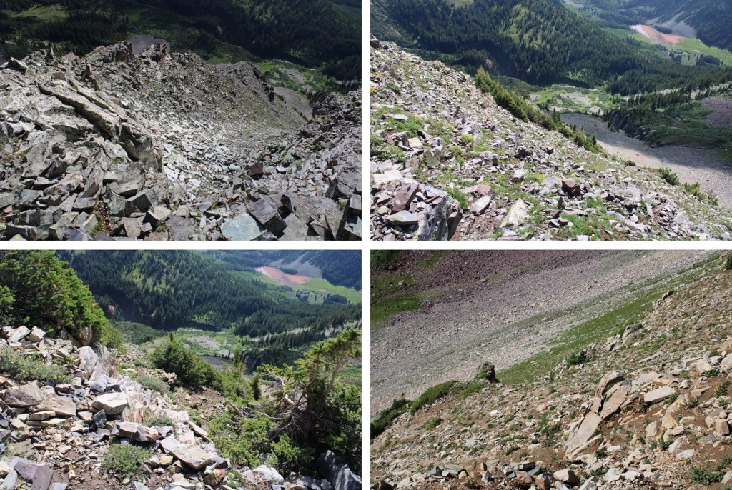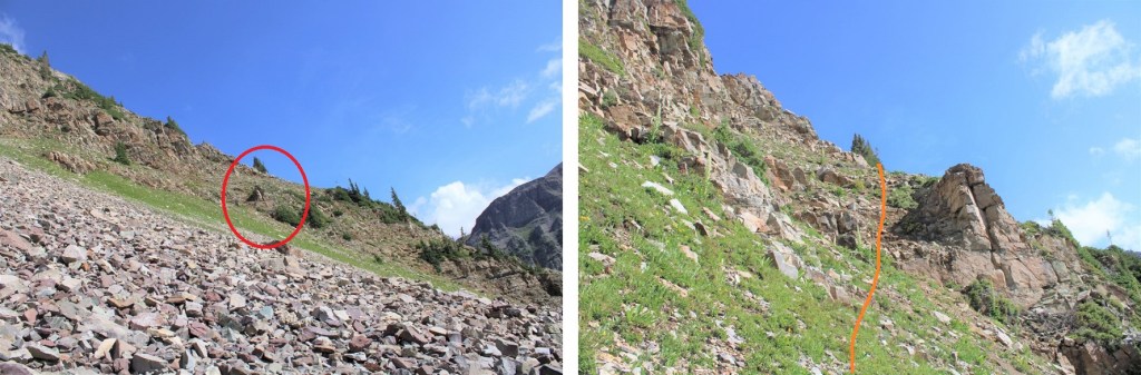 And now, the fun route finding begins! I descended the false summit 125’ and crossed a gully. There were cairns here to help in the crossing (circled in red). These are steep and go at class 3/4