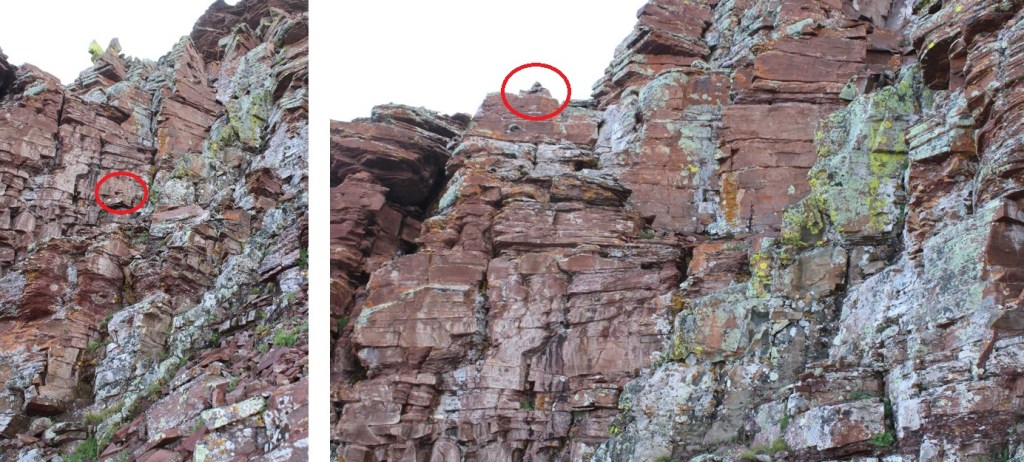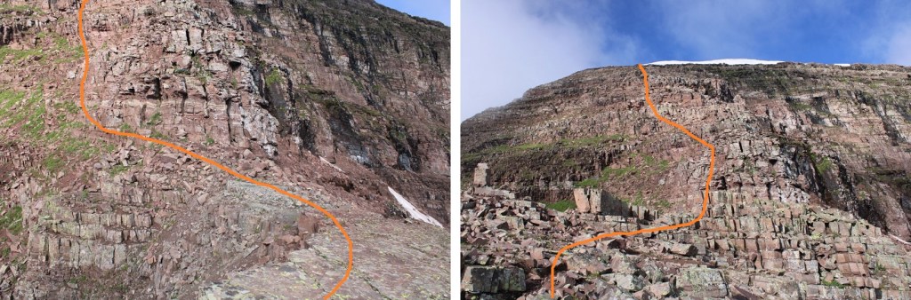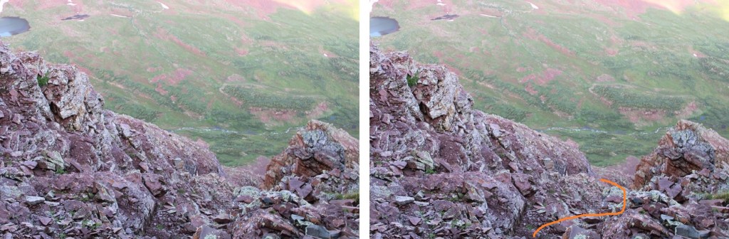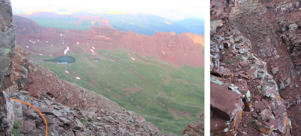 Here are some more images of that ledge, looking back. Remember to look for the cairn, and stay level with it.