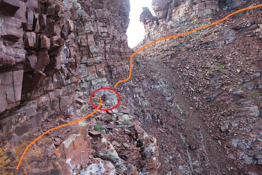 The ledge is not as bad as it looks. There’s a cairn here (circled in red) DO NOT DESCEND HERE. Instead, use it as a reference point and stay level with it (especially on your way back) and continue following the ledge. If you do this, it stays class 2 to the saddle.