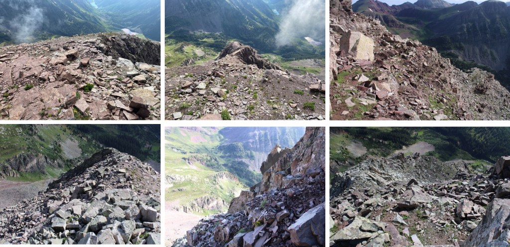 From here it became ‘choose your own adventure’ as I followed the ridge southwest. I started out rounding the ridge’s north side, and then went back and forth between north and south sides of the ridge a few times. There are cairns here, and nothing is more difficult than class 4. In fact, if you’re extra careful/spend a lot of time route finding, you can probably keep this at mostly class 3. Here’s the route I took: