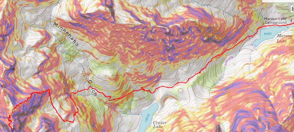 Here’s an overview of the trek to the false summit (or ‘the crown’) from the creek crossing. I followed the North Maroon Peak’s Northeast Ridge Route until I made it to tundra, at about 11,600’. I then left the trail and headed northwest, behind this outcropping, to the base of the white gully. I then trekked up the ridge and followed the white gully until it ended. Here’s a basic overview.