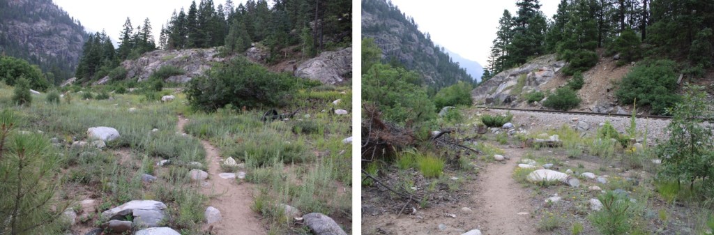 There will be an obvious place to cross the tracks. Funny story: when I was crossing the tracks this time and taking pictures the train blew its whistle from what felt like very close. I’m sure they do that to warn people to get away from the tracks at the crossing (I also heard it on my way back). If you hear the whistle, you have less than a minute to remove yourself from the tracks before the train arrives. Cross the tracks and continue on the class 1 trail as it hugs the Animas River and the Mountainside